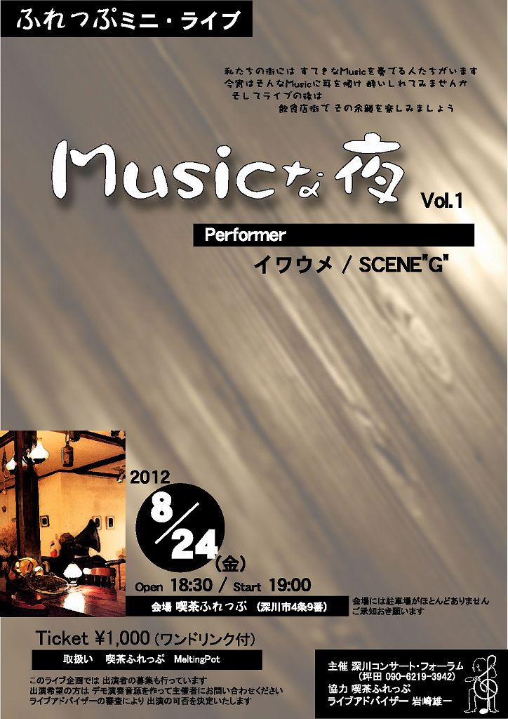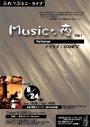 この度地域で頑張って活動している音楽愛好者のみなさんに良質なライブ環境を提供し、地域の新たな音楽シーンを創造するライブシリーズとして「ふれっぷミニライブMusicな夜」を企画しました。