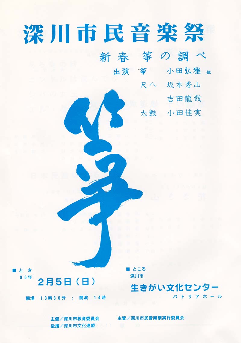 1994年度深川市民音楽祭(第15回) 2017年06月23日 21:14 音楽祭として初めて邦楽に取り組んでの公演。箏曲により古典だけでなくポップス、絵を投射しながらの演奏と多彩な演出を行いました。 日時:1995年2月5日 会場:深川市生きがい文化センター パトリアホール 出演:小田弘雅(箏)他 箏曲演奏(1) 箏曲演奏(2) プログラム表紙 「市民音楽祭」カテゴリの最新記事 < 前の記事次の記事 > コメント コメントフォーム 名前 コメント 評価する リセット リセット 顔 星 投稿する 情報を記憶