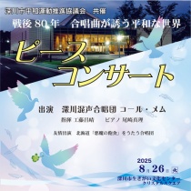 深川市生きがい文化センターでは年に何度かのロビーコンサートを事業として開催していますが、その一つを「ピースコンサート」として平和運動推進事業と位置付けています。今年の「ピースコンサート」は長年深川で合唱団体として活動している深川混声合唱団コール・メムのみ ...